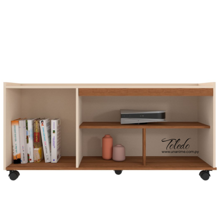 El Rack Toledo Cinamomo Mel y Pérola Metalizado combina elegancia y funcionalidad, con diseño moderno, espacio para dispositivos y decoración, además de ruedas que facilitan su movilidad. Ideal para realzar tu sala con estilo.