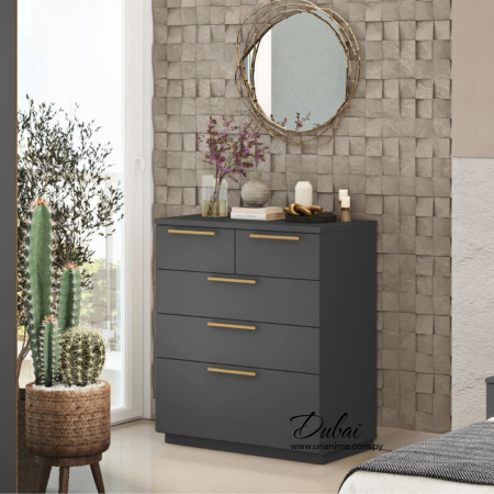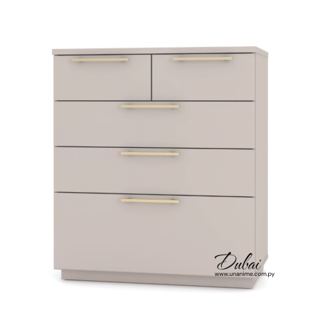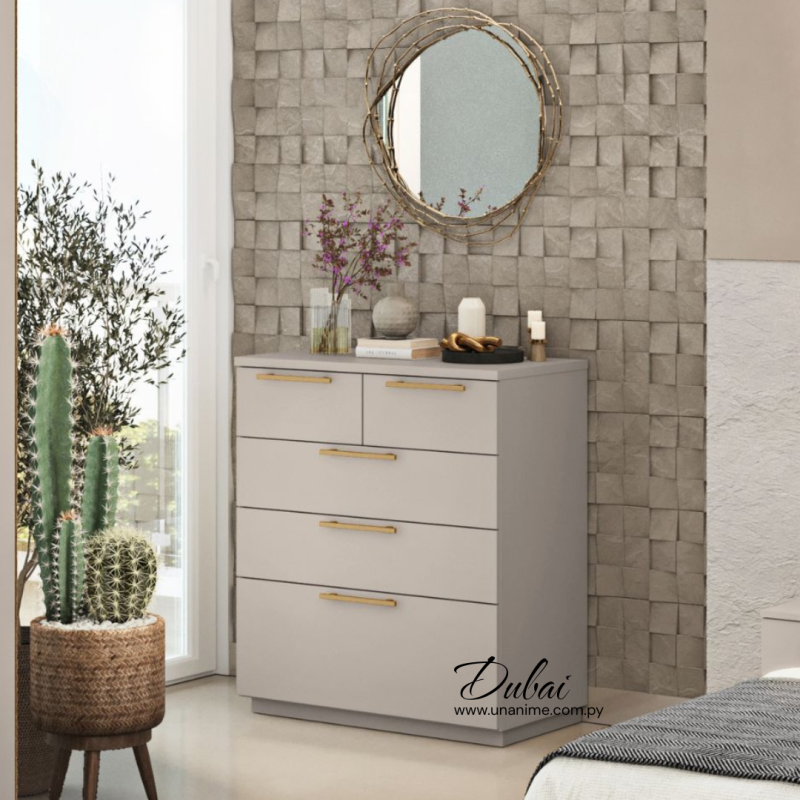 Cómoda Dubai combina elegancia y funcionalidad. Con un acabado neutro y detalles dorados, este tocador de cajones es la elección perfecta para quienes buscan una solución de almacenamiento sin sacrificar el estilo.