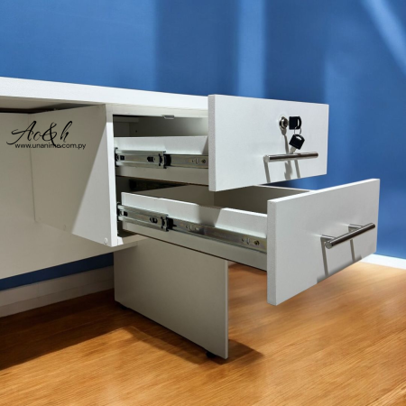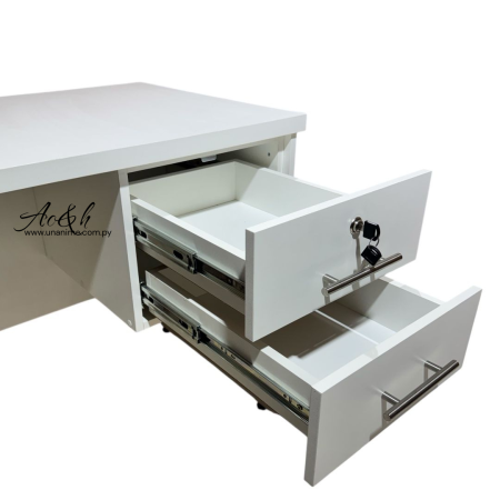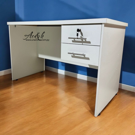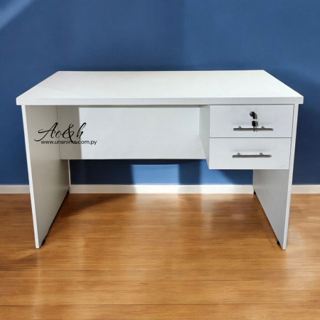 Práctico y elegante escritorio de 1,20 m., ideal para oficina o estudio. Diseño moderno en color blanco, con superficie amplia y resistente. Incorpora dos cajones funcionales, uno con cerradura y llave, ofreciendo mayor organización y seguridad en el día a día.