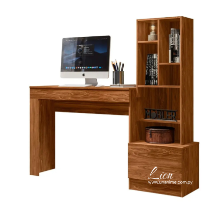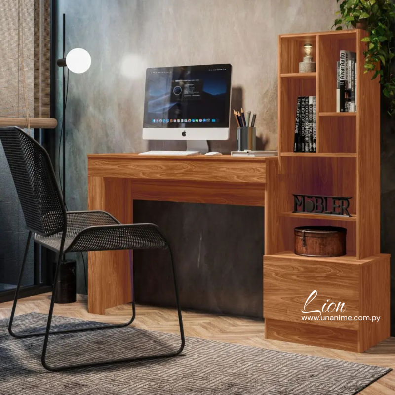 Moderno y funcional, el Escritorio Lion combina diseño limpio con estantería lateral integrada para mantener todo organizado. Ideal para espacios de trabajo o estudio, ofrece practicidad sin perder estilo.