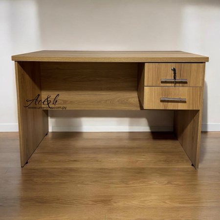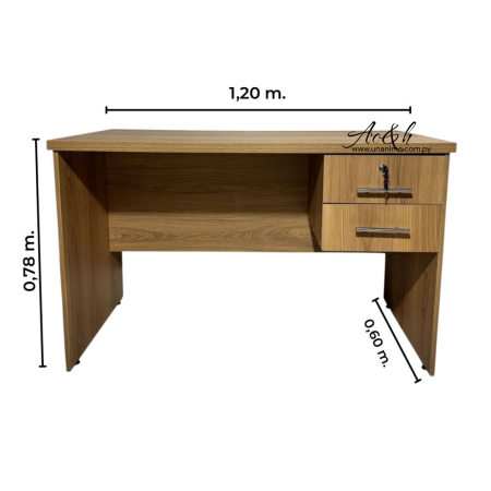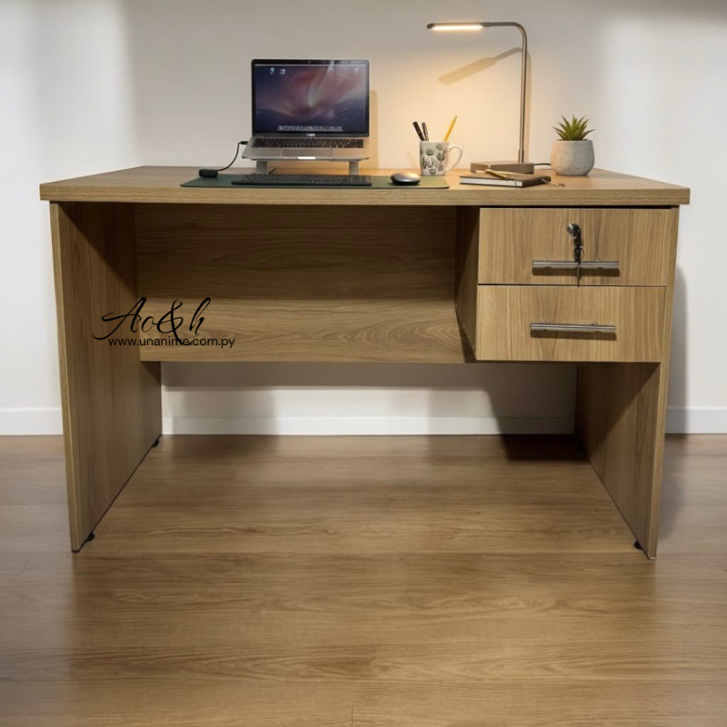 Práctico y elegante escritorio de 1,20 m., ideal para oficina o estudio. Diseño moderno en color blanco, con superficie amplia y resistente. Incorpora dos cajones funcionales, uno con cerradura y llave, ofreciendo mayor organización y seguridad en el día a día.