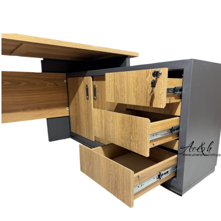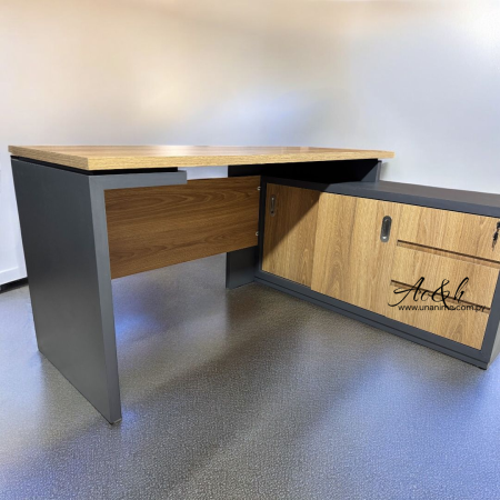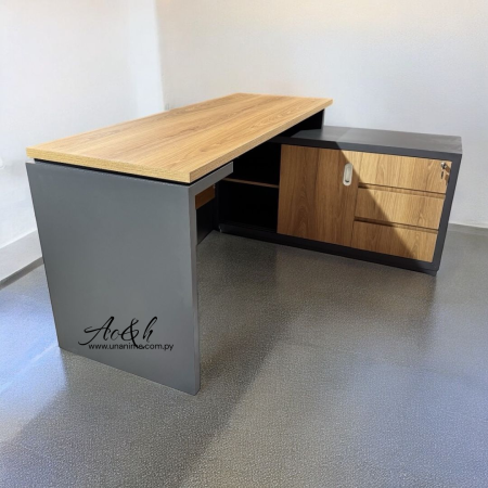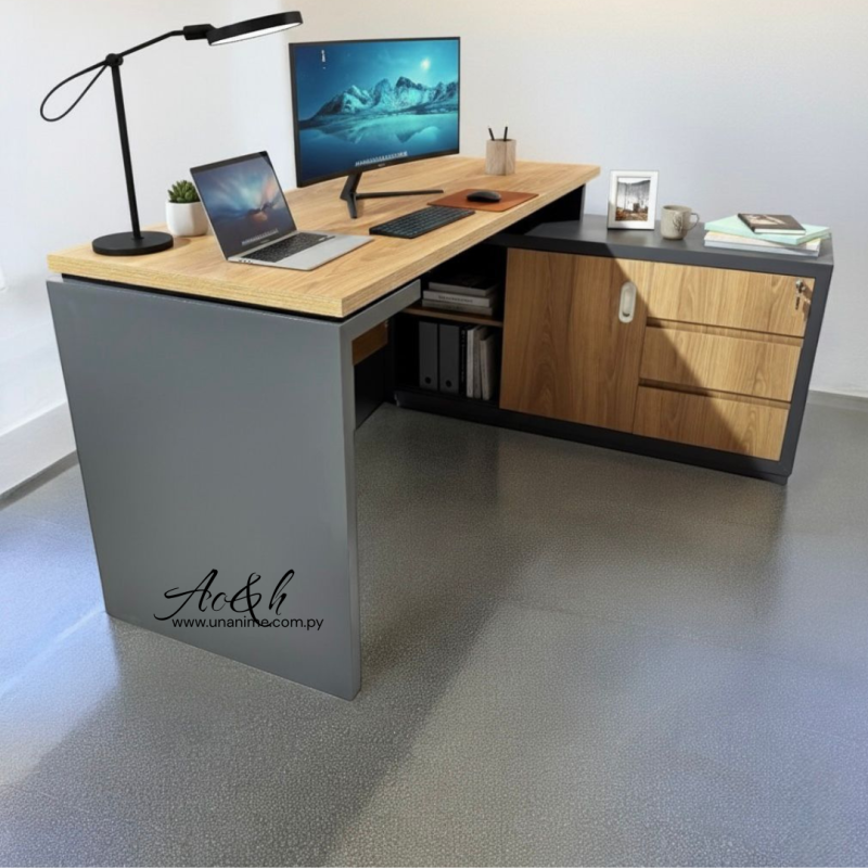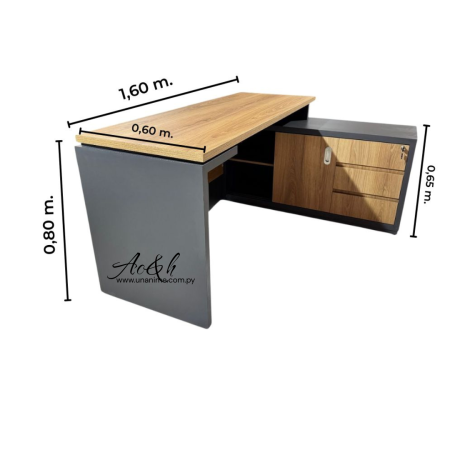 Fabricado en melamina doble placa, con armario lateral de 3 cajones con guías telescópicas, cerradura central, puertas corredizas y patitas regulables. Funcional, resistente y perfecto para optimizar tu espacio de trabajo.