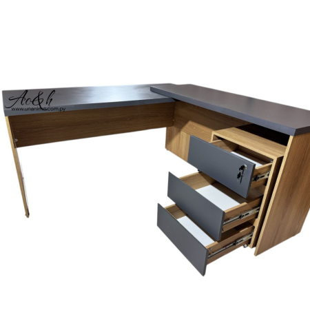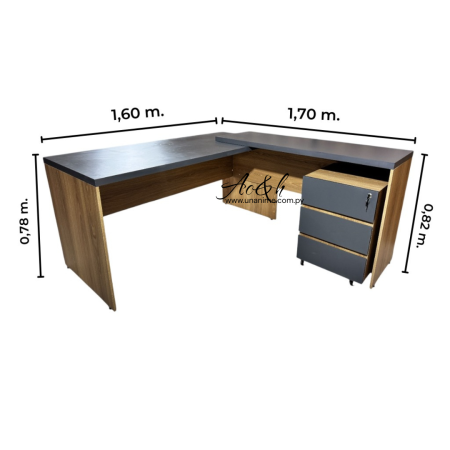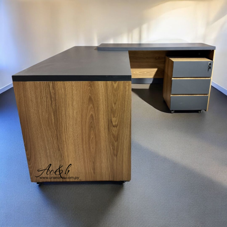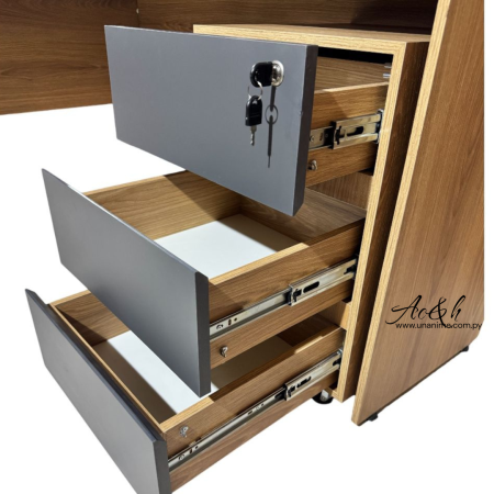 Fabricado en melamina, con cajonero volante de 3 cajones con guías telescópicas, cerradura central y patitas regulables. Funcional, resistente y perfecto para optimizar tu espacio de trabajo.