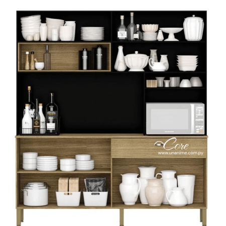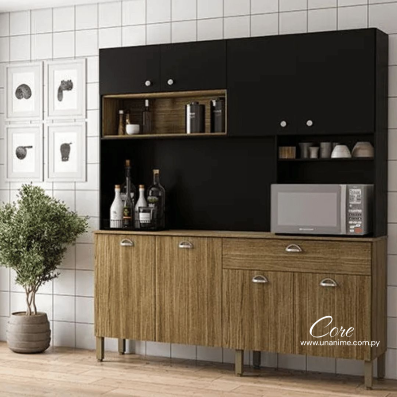 Diseño elegante y moderno en tonos oscuros y madera natural. Ideal para quienes buscan estilo y practicidad con gran capacidad de almacenamiento.