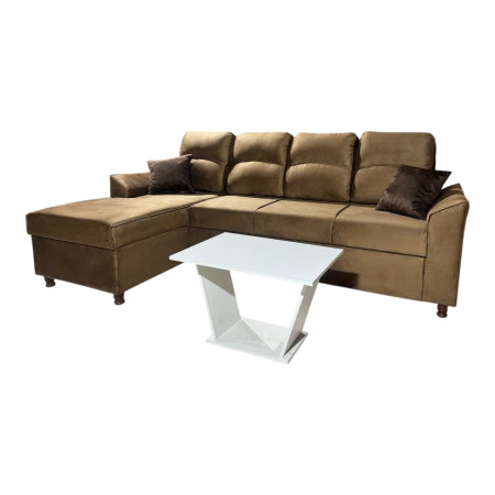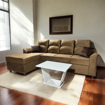 El Sofá New San Lorenzo 3 + chaise combina diseño moderno y comodidad gracias a su estructura de madera reforestada, espuma de alta densidad y tapizado en tela pana 100% poliéster; incluye mesita de centro y dos almohaditas decorativas de regalo, convirtiéndolo en la opción ideal para renovar tu sala con estilo y confort garantizado.