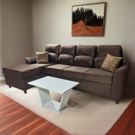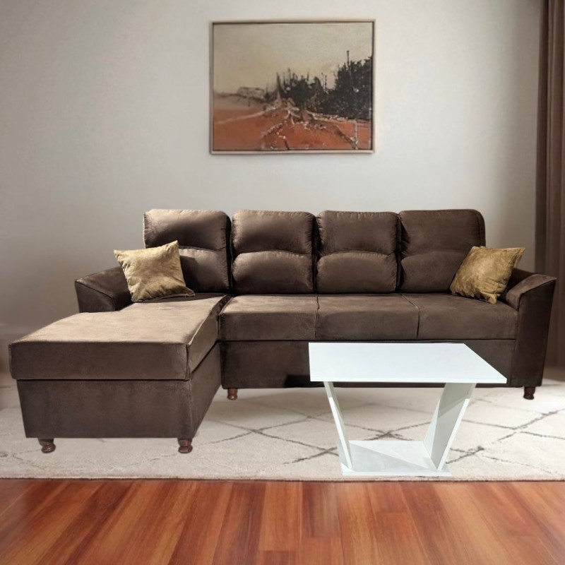 El Sofá New San Lorenzo 3 + chaise combina diseño moderno y comodidad gracias a su estructura de madera reforestada, espuma de alta densidad y tapizado en tela pana 100% poliéster; incluye mesita de centro y dos almohaditas decorativas de regalo, convirtiéndolo en la opción ideal para renovar tu sala con estilo y confort garantizado.