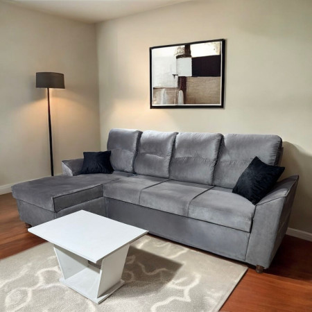 El Sofá New San Lorenzo 3 + chaise combina diseño moderno y comodidad gracias a su estructura de madera reforestada, espuma de alta densidad y tapizado en tela pana 100% poliéster; incluye mesita de centro y dos almohaditas decorativas de regalo, convirtiéndolo en la opción ideal para renovar tu sala con estilo y confort garantizado.