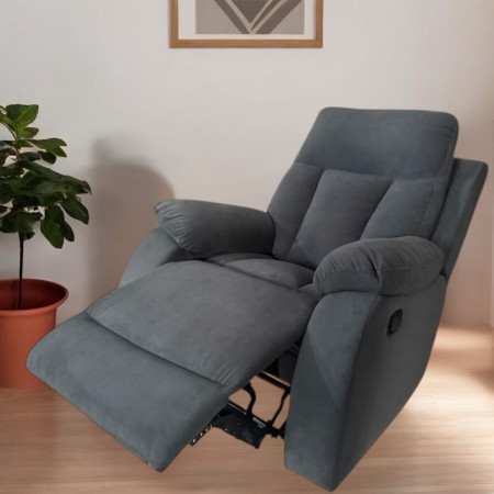 Poltrona reclinable en color gris, tapizada en suave tela de lino. Su diseño moderno y mecanismo reclinable ofrecen comodidad y estilo, ideal para cualquier espacio.