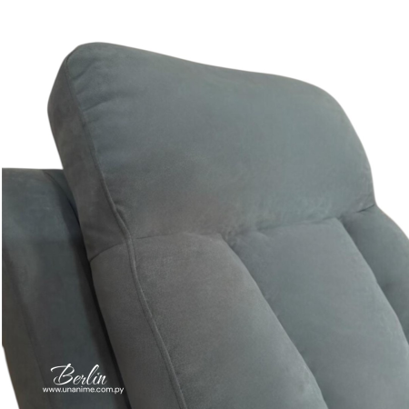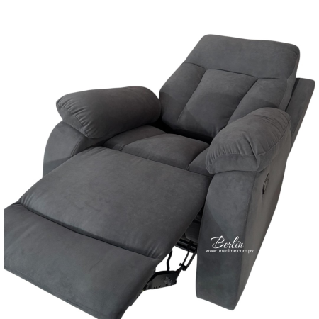 Poltrona reclinable en color gris, tapizada en tela semi impermeable. Su diseño moderno y mecanismo reclinable ofrecen comodidad y estilo, ideal para cualquier espacio.