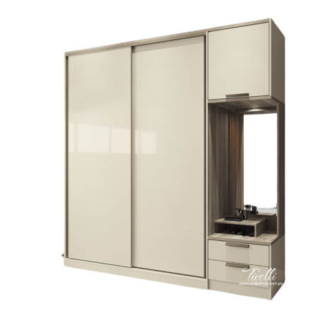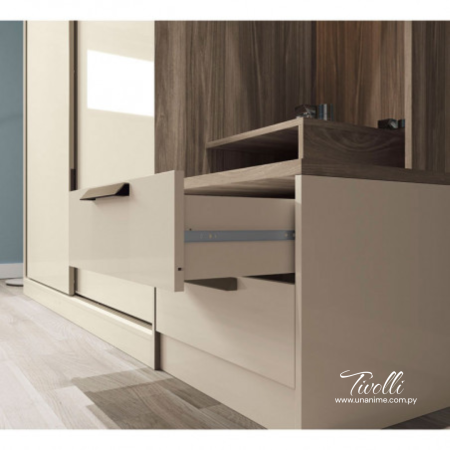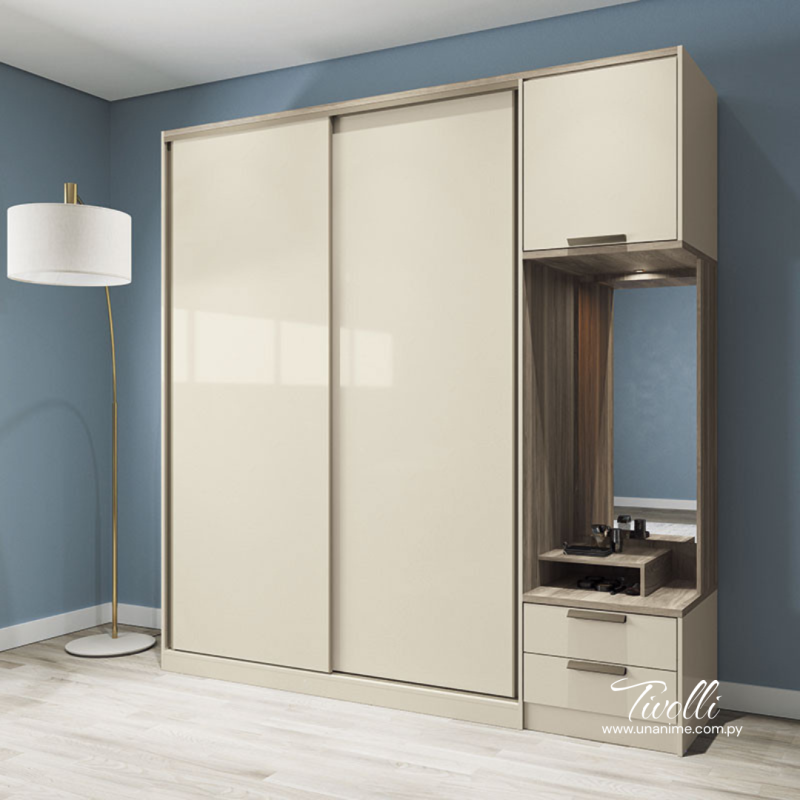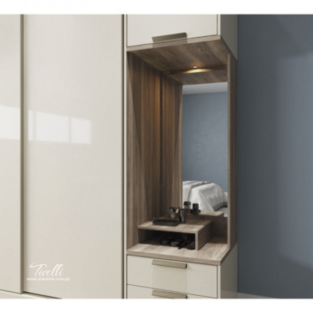 Con un diseño innovador y moderno el ropero Tivolli tiene todo lo que necesitas ya que cuenta con 1 espejo, 1 soporte de repisa para soporte de perfumería, luz led en el espejo con interruptor,  Maletero, Zapatero con espacio para 2 nichos y gran espacio para una mejor organización.
