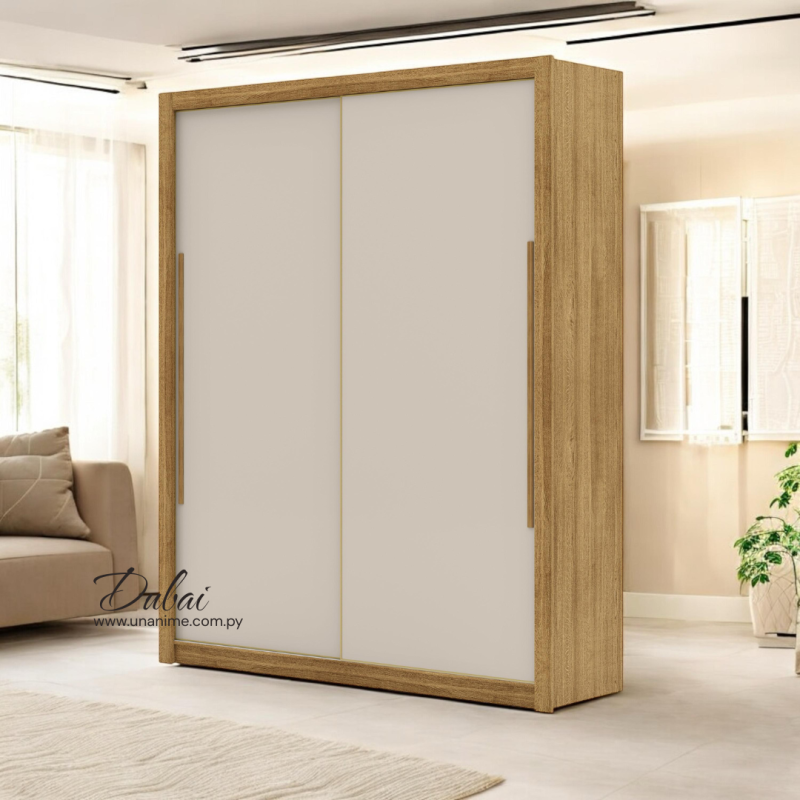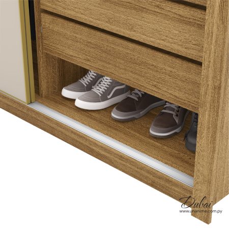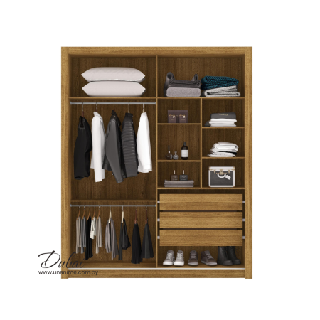 Este elegante ropero ofrece un diseño moderno y funcional para tu hogar. Con puertas corredizas de deslizamiento suave, rieles de aluminio y perfiles metálicos que garantizan durabilidad. Tiradores modernos en MDF revestido, cajones con correderas telescópicas y barra para perchas de aluminio.