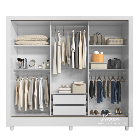 El Ropero Vienna es la opción perfecta para quienes buscan un armario sofisticado, espacioso y con un diseño contemporáneo. Su estructura robusta y acabados impecables garantizan no solo un toque de elegancia en tu dormitorio, sino también la mejor solución para organizar tu ropa y accesorios con comodidad.